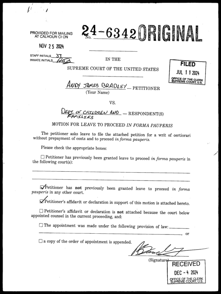 The Motion for Leave to Proceed in Forma Pauperis is a legal request that allows individuals who cannot afford court costs to file actions in court. This motion is particularly important for those looking to seek justice through the U.S. Supreme Court, especially when petitioning for a writ of certiorari. By submitting this motion, petitioners can gain access to the legal system without the burden of significant fees.