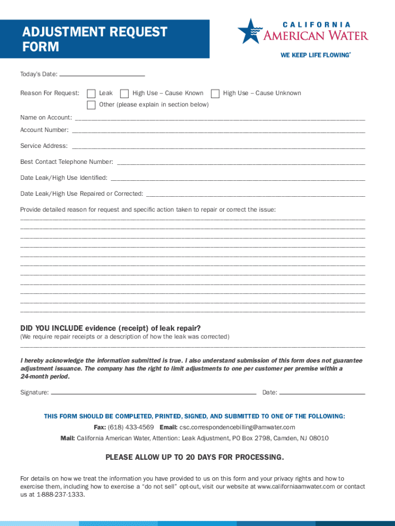 Once the California American Water Leak Adjustment Form is submitted, customers can expect a processing timeframe of up to 20 days. It’s important to keep track of the submission, which can be confirmed through customer service. Following up helps ensure that the request is in progress and on track for timely processing.