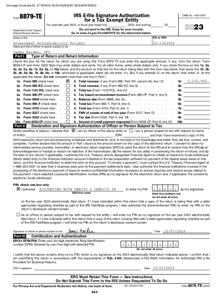 The IRS Form 8879-TE serves as a Signature Authorization that allows tax-exempt entities to authorize their tax returns for electronic filing.