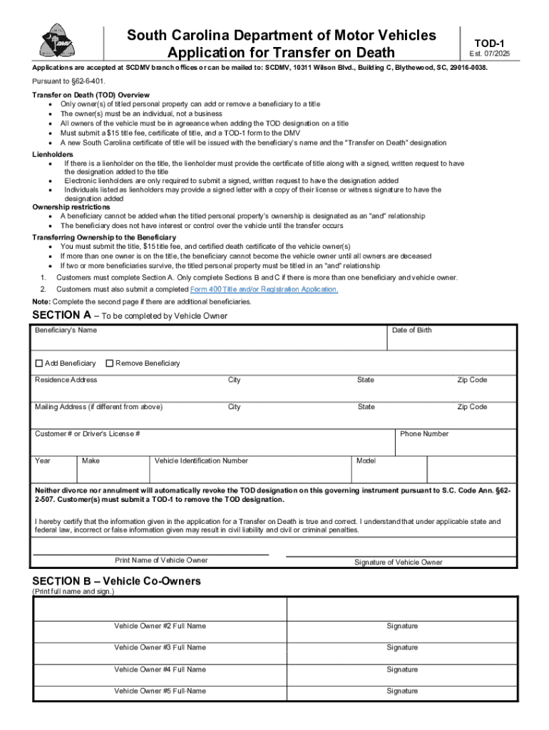 The South Carolina TOD-1 Transfer on Death Application is a crucial legal form that allows vehicle owners to designate a beneficiary for the transfer of their vehicle upon death. Proper completion of the SC TOD-1 form is essential to ensure a smooth transition of ownership, protecting both the decedent's wishes and the beneficiary's rights. This form requires signatures from vehicle owners and co-owners to validate the designation.