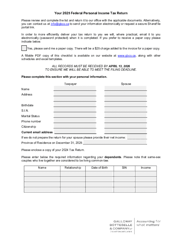 The 2025 Federal Personal Income Tax Return Checklist serves as an essential tool for Canadian taxpayers, guiding them through the process of preparing their personal income tax returns. This checklist is vital for ensuring all necessary information is gathered and organized efficiently, which contributes to accurate filing and compliance with Canadian tax regulations.