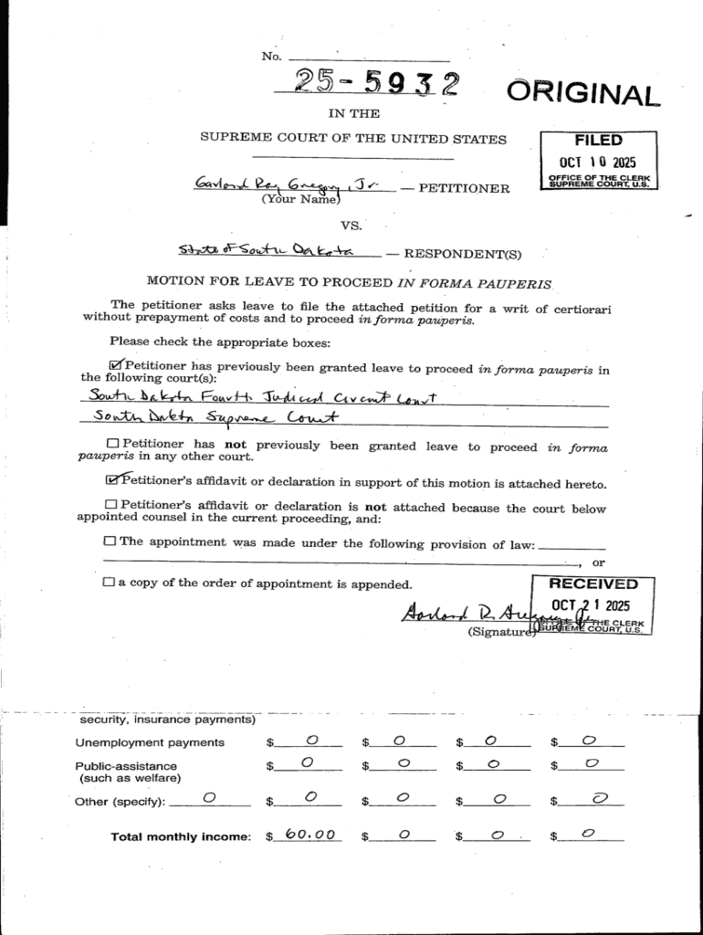 The Motion for Leave to Proceed in Forma Pauperis is a legal document that enables individuals to file their cases in the United States Supreme Court without the burden of prepaying court fees. This motion is crucial for those who cannot afford the financial implications of litigation and serves as a vital mechanism within the U.S. legal system. Its significance lies in allowing access to justice for low-income petitioners, ensuring that financial hardship does not preclude someone from seeking legal recourse.