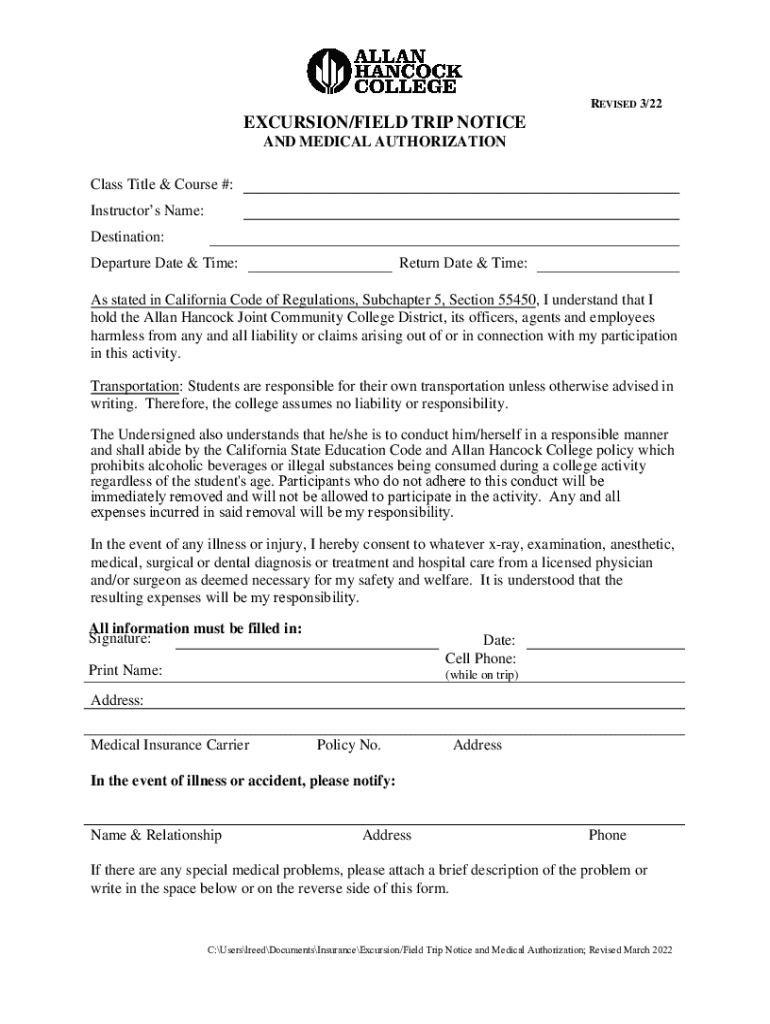 The Excursion Field Trip Notice and Medical Authorization is a permission and medical consent form used by students at Allan Hancock College to authorize participation in field trips.