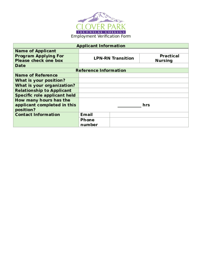 The Employment Verification Form is an essential document used primarily for verifying applicants' employment history, specifically for nursing program applications. This form plays a crucial role in confirming the professional background of candidates, ensuring they meet the necessary qualifications for entry into nursing programs.