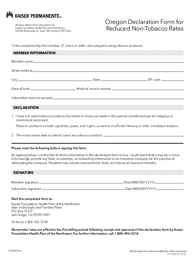 Submitting the Oregon Tobacco Use Declaration Form provides several key benefits for members. Firstly, by declaring non-tobacco use, members can qualify for potentially lower health insurance premiums with the Kaiser Foundation Health Plan. Additionally, the form helps streamline the process of maintaining up-to-date health records and enhances the accuracy of claims processing.