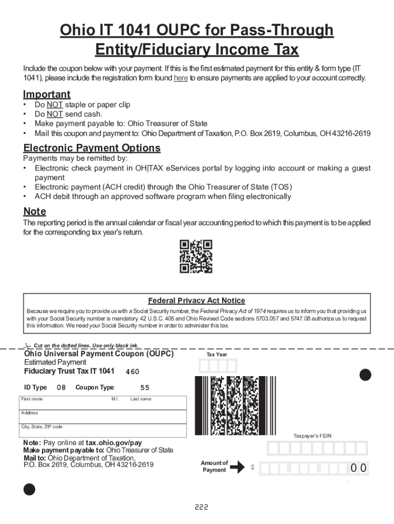 The Ohio IT 1041 OUPC form is a critical document used by pass-through entities and fiduciaries in Ohio for making estimated income tax payments. This form is essential for compliance with state tax regulations and provides a straightforward way to report income and associated taxes.