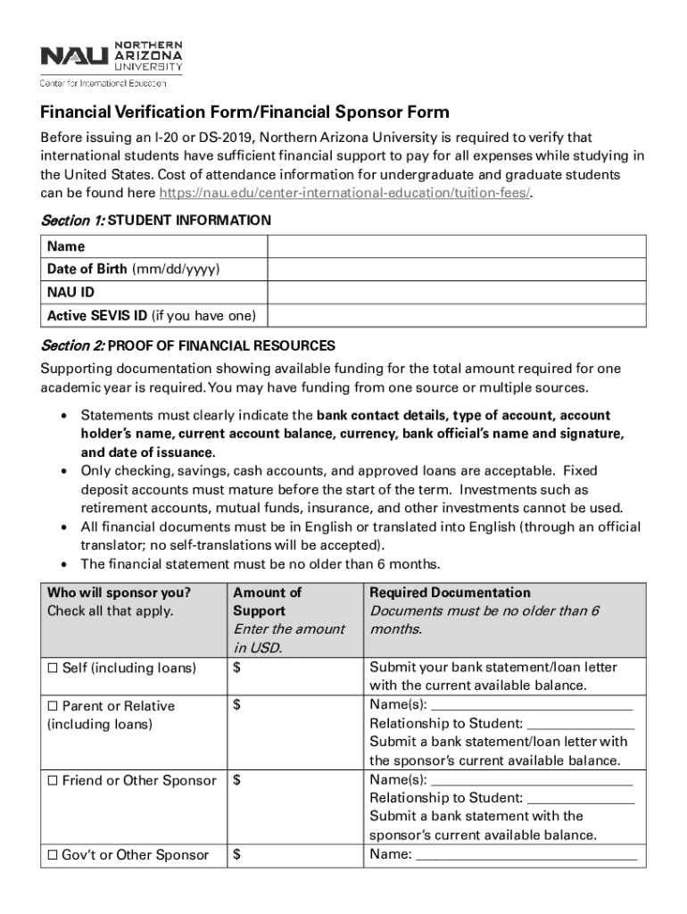 The Financial Verification Form is mandatory for international students applying to Northern Arizona University, who must demonstrate sufficient financial resources for their studies in the U.S.