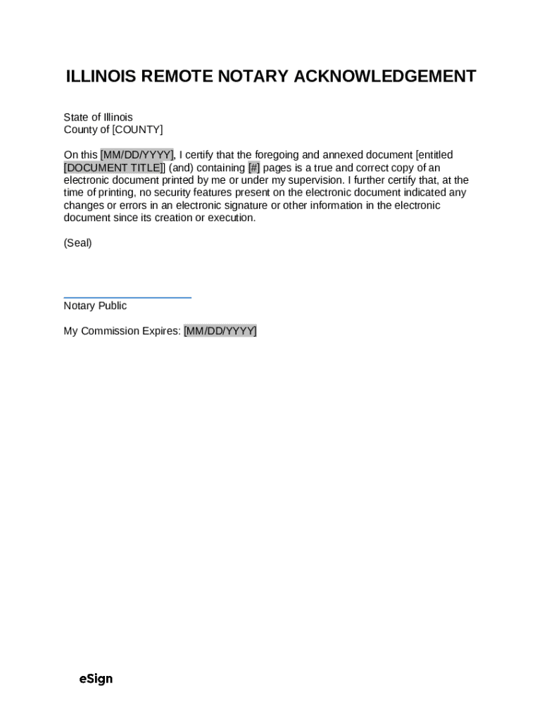 The Illinois Remote Notary Acknowledgement can be used by any Notary Public officially registered in Illinois to notarize electronic documents. It is essential that Notary Publics understand state regulations governing remote notarization.
