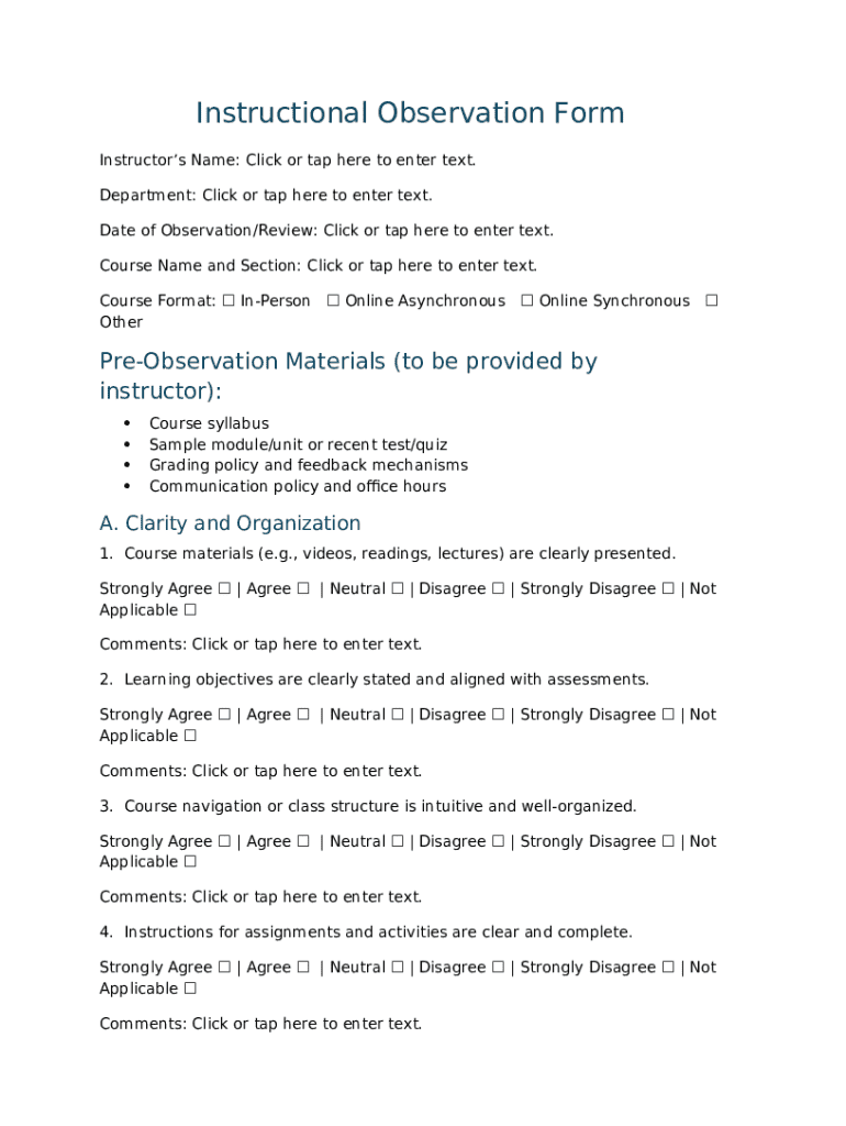 The Instructional Observation Form serves as a vital tool for evaluating instructor performance within educational settings. This comprehensive form includes several key sections that assess aspects such as clarity of instruction, student engagement, and overall professionalism.