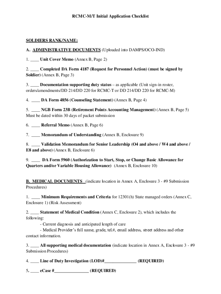 The RCMC-M/T Initial Application Checklist serves as a critical tool for soldiers seeking managed care within the military healthcare system. This essential form facilitates the submission of necessary medical documentation and administrative paperwork. Required documents include the DA Form 4187 and the DA Form 4856, which play pivotal roles in the application process.