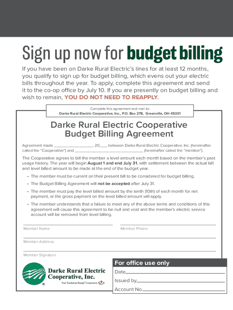 Eligibility for the Darke Rural Electric Budget Billing Agreement includes all members of the Darke Rural Electric Cooperative who are current on their electric bills and wish to apply for budget billing to stabilize monthly payments.