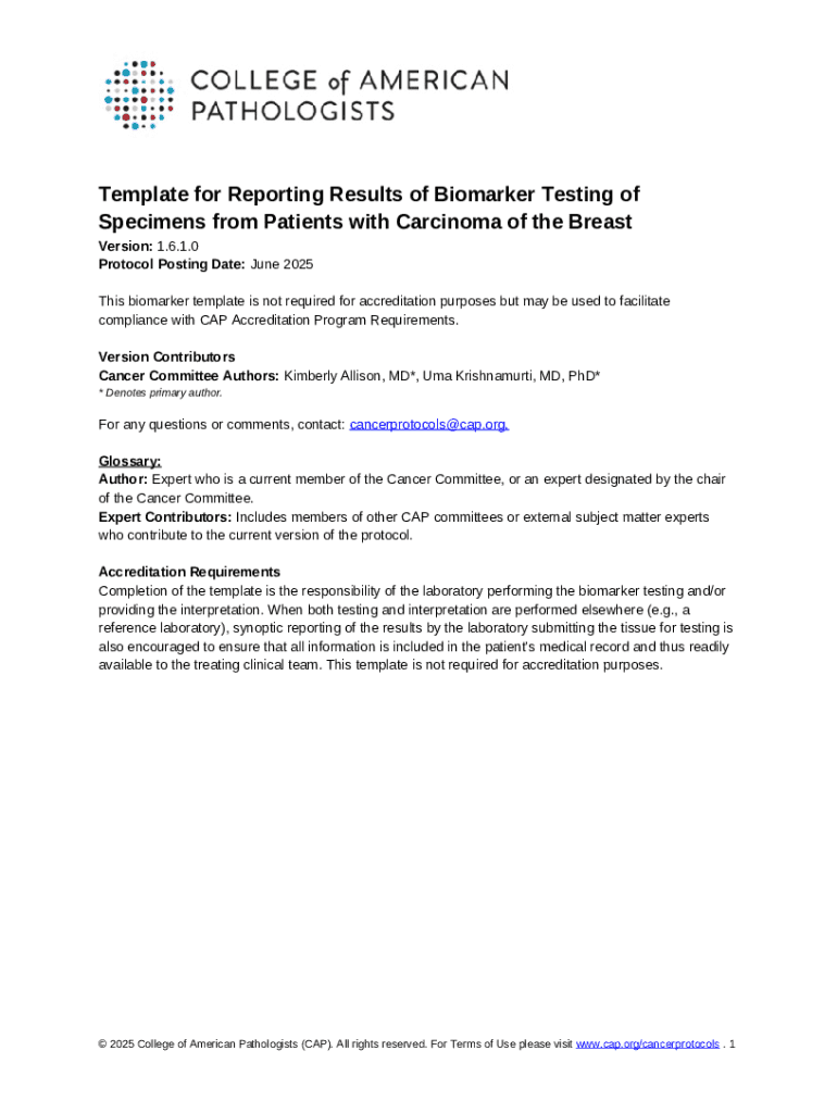 The Breast Biomarker Reporting Template is a specialized document used to report biomarker testing results for breast carcinoma. This template serves as a standard format that facilitates compliance with the CAP Accreditation Program. Key components of the template include robust reporting fields for critical biomarkers such as estrogen receptor (ER), progesterone receptor (PgR), and HER2 status.