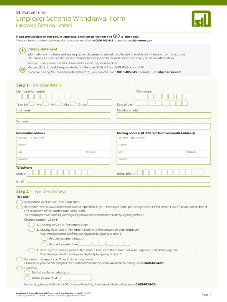 The Employer Scheme Withdrawal Form is specifically designed for members of the SIL Employer Scheme, as well as their respective employers. Eligibility criteria generally includes active participation in the scheme and situations requiring a withdrawal such as resignation or retirement.
