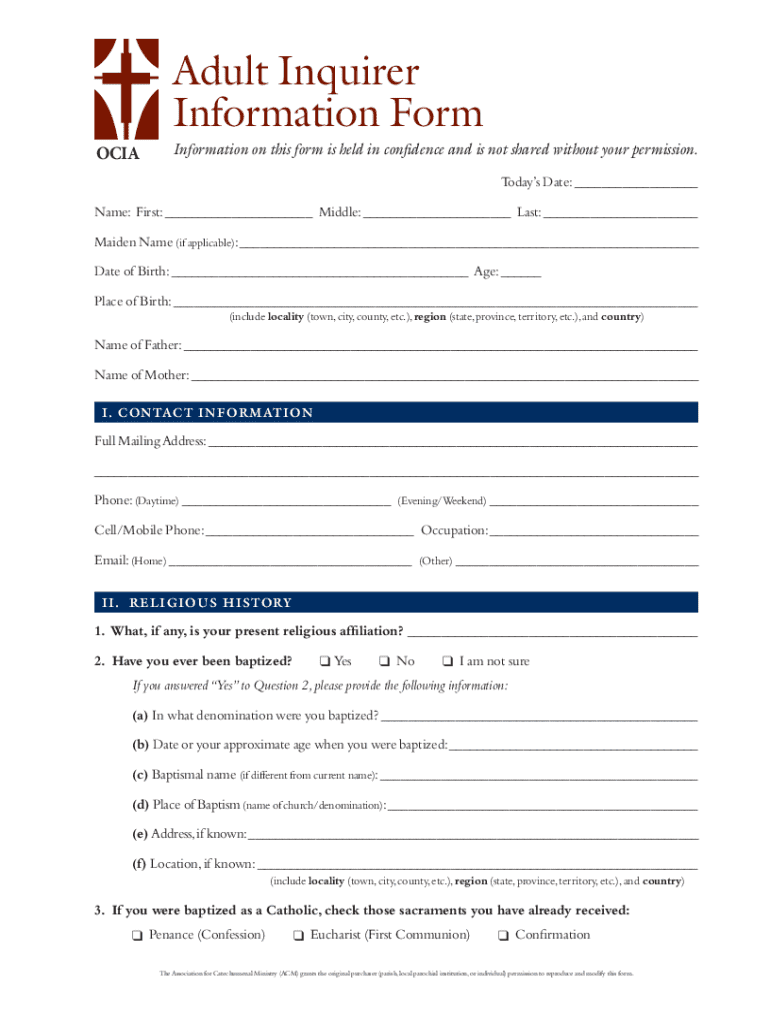 The Adult Inquirer Information Form is a personal document used by individuals seeking to learn more about the Catholic Faith by providing their personal, religious, and family information.