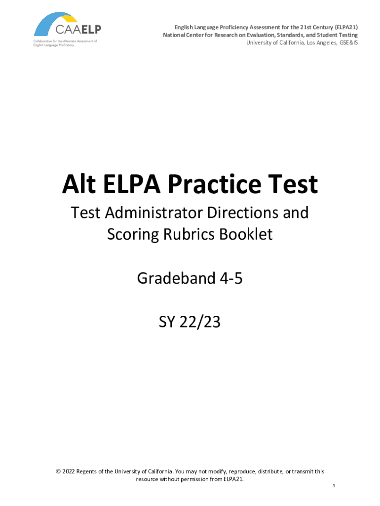 To use the Alt ELPA Practice Test Administrator Directions, you should be a registered test administrator for the Alt ELPA. Familiarity with the testing process is highly recommended.