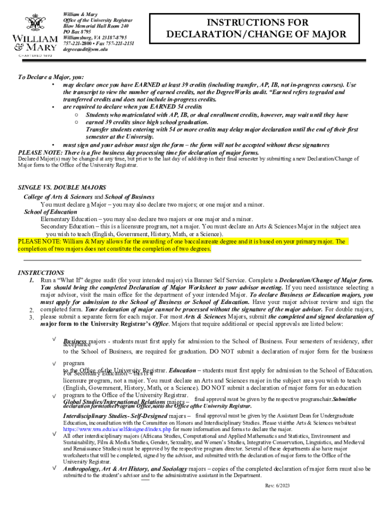 The Declaration/Change of Major Form is an education document used by students at William & Mary to officially declare or change their major.