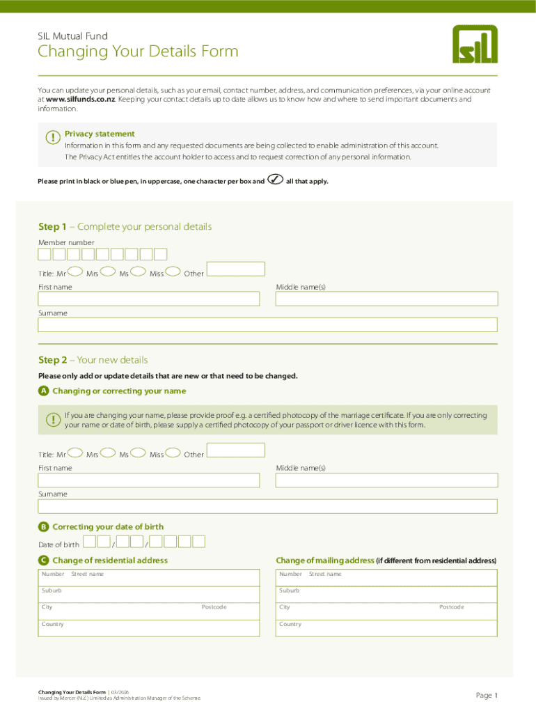 This form is intended for current members of the SIL Mutual Fund who need to update their personal details. Only members who have signed up and maintain accounts with Mercer (N.Z.) Limited can fill out this form.