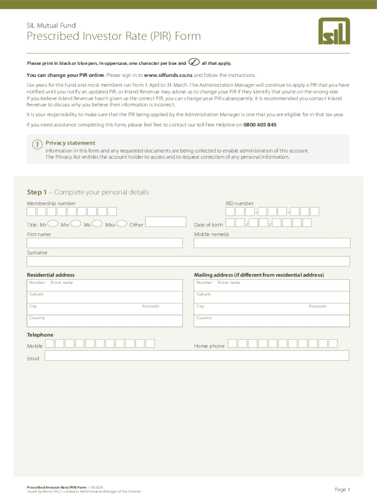 The SIL Mutual Fund PIR Form is crucial for tax reporting, enabling investors to inform the Administration Manager of their Prescribed Investor Rate (PIR). This form plays a significant role in ensuring correct tax compliance according to the New Zealand tax laws. The validity of the form spans from 1 April to 31 March of each tax year, underscoring its importance in tax planning.
