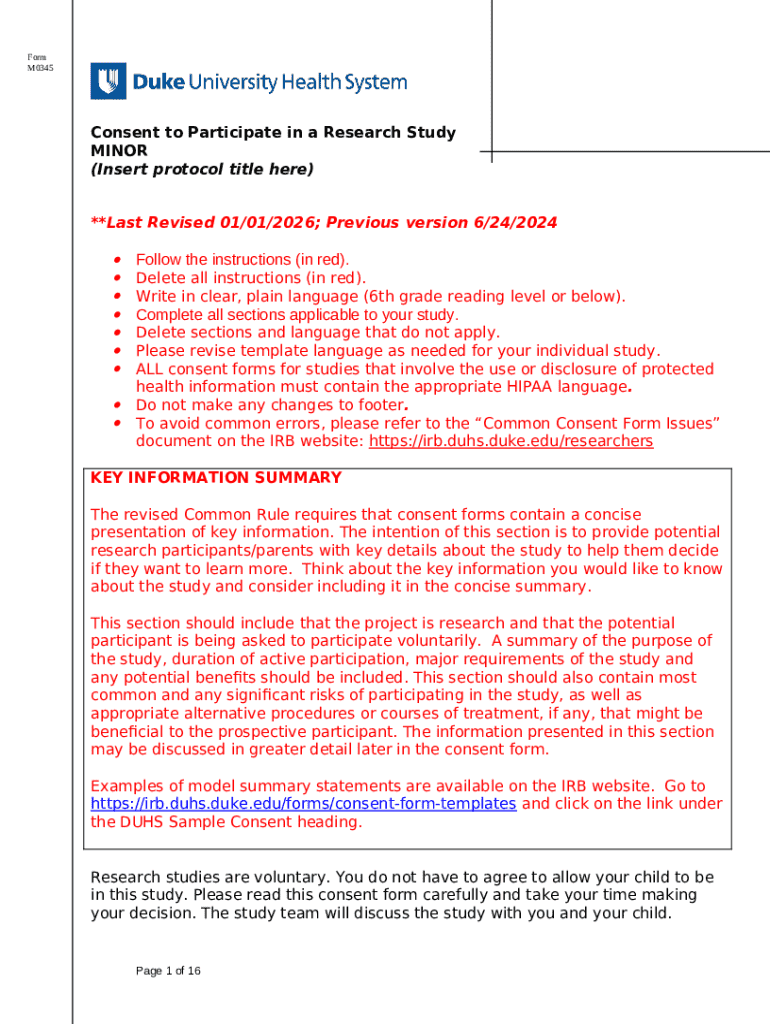 The Consent to Participate in a Research Study, specifically the M0345 form, serves as a crucial document that outlines the necessary consent for minors participating in research activities. This form is essential to ensure that parental consent is obtained, complying with all relevant legal regulations. Additionally, it addresses important aspects such as HIPAA compliance, which protects the handling of personal information related to the study.