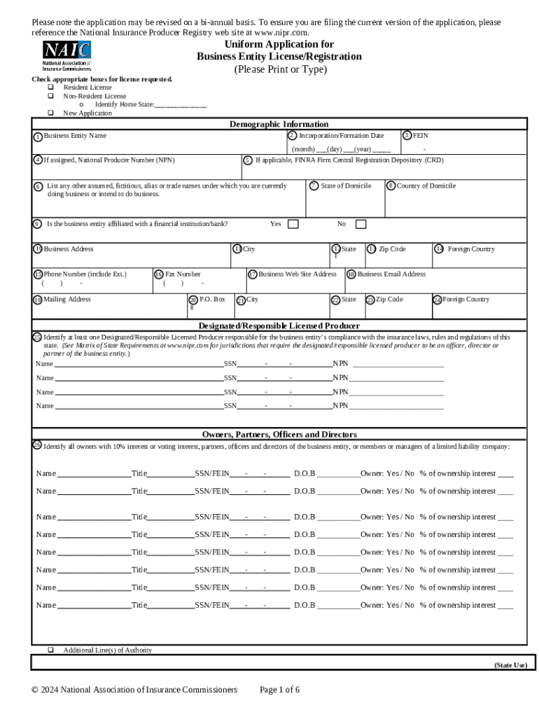 The Uniform Business Entity License/Registration Application is a business form used by entities to apply for insurance licenses or registrations in different jurisdictions.