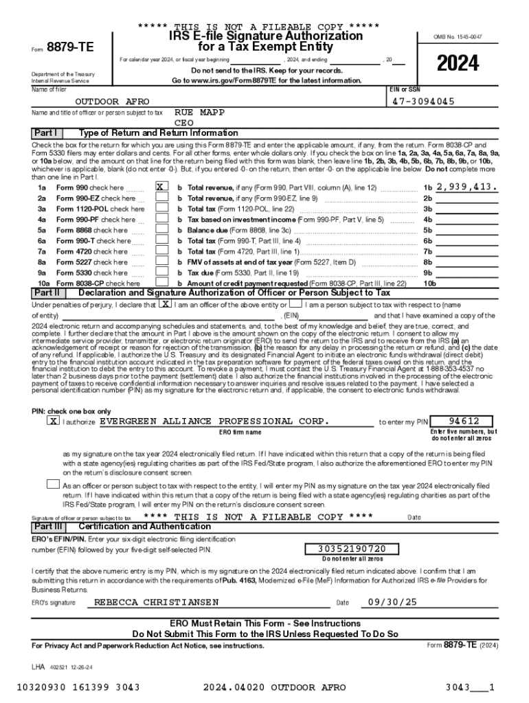 IRS Form 8879-TE serves as an electronic signature authorization for tax-exempt entities, allowing them to file tax returns electronically. This form is crucial for the 2024 tax year as it simplifies the submission process for organizations that require tax-exempt status. It is essential to pair this form with related IRS forms such as Form 990 and Form 990-EZ to ensure proper compliance and complete tax reporting.