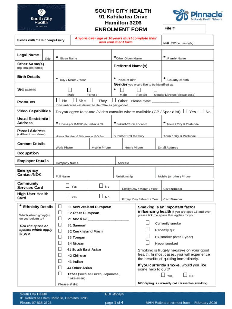 The South City Health Patient Enrolment Form serves as a critical tool for individuals enrolling as patients at South City Health in Hamilton, New Zealand. This form is essential for collecting vital personal details including legal name, birth information, address, and contact data. By facilitating a structured approach to patient registration, this form plays a key role in ensuring that health services are accessible and streamlined for new patients.