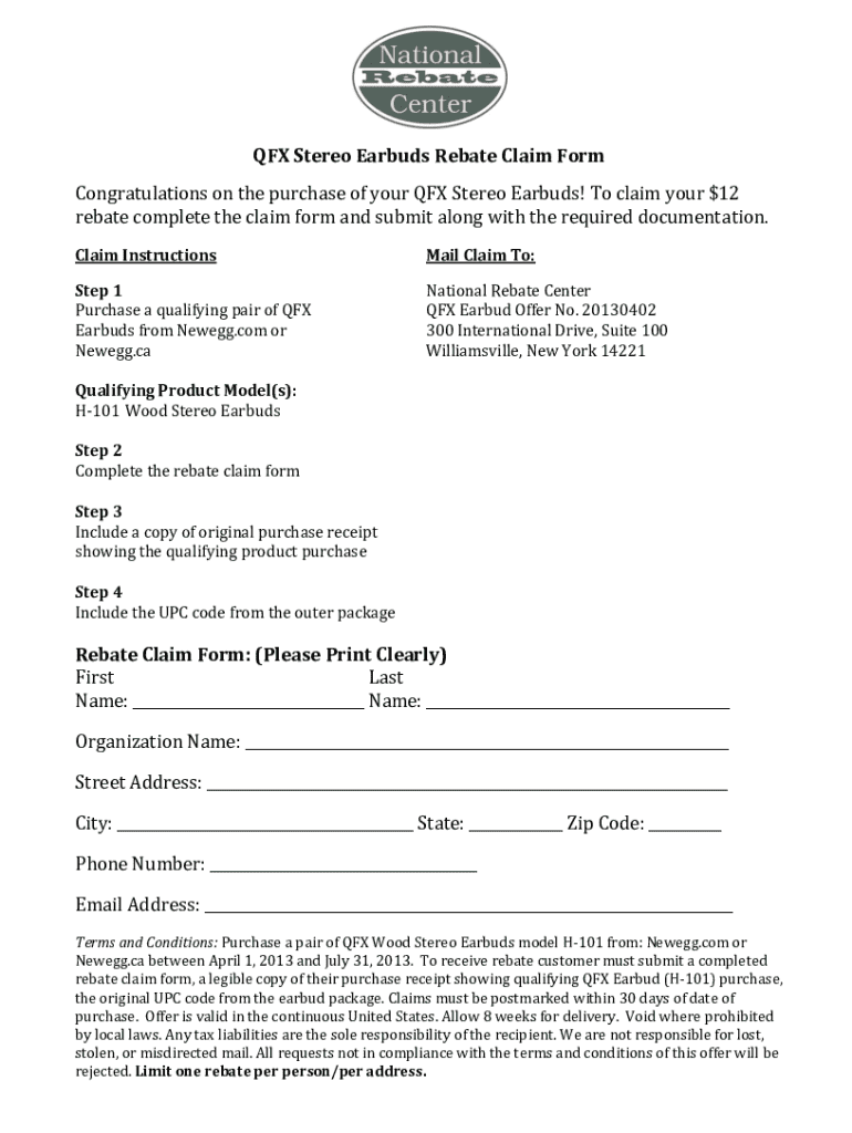 The QFX Stereo Earbuds Rebate Claim Form must be printed and mailed. Electronic submissions are generally not accepted for this type of rebate claim.