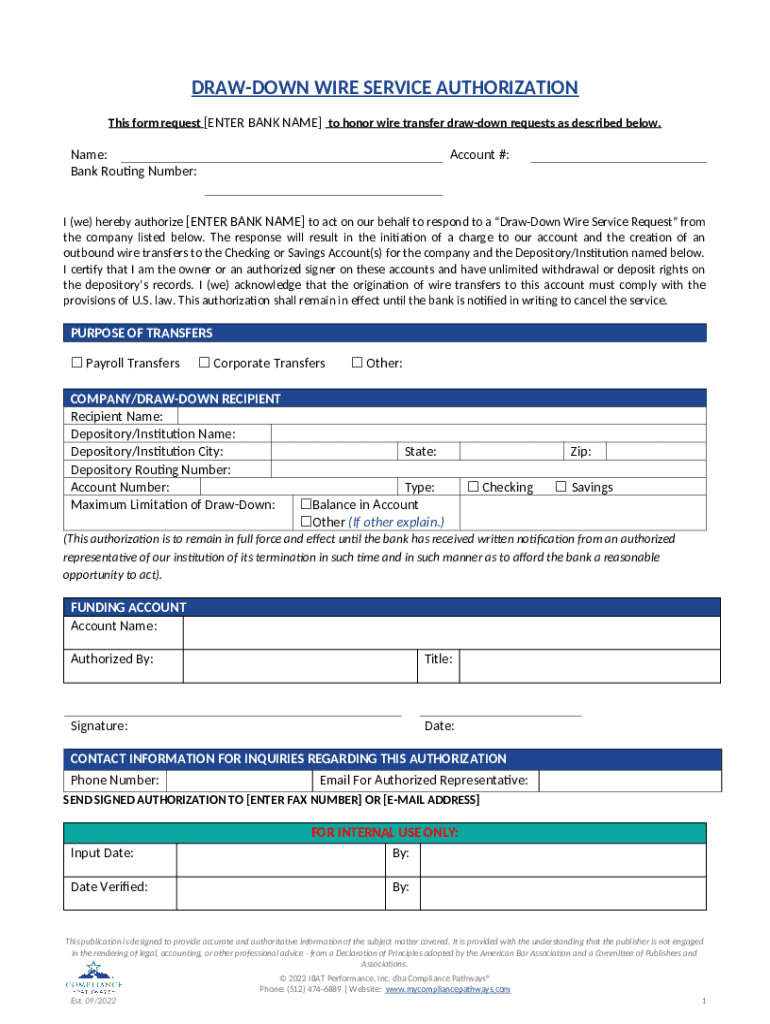 The Draw-Down Wire Service Authorization is a service agreement used by businesses to authorize their bank to process wire transfer draw-down requests for account holders.