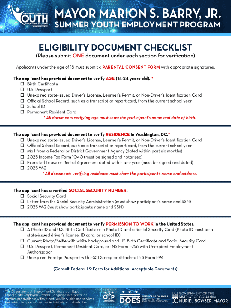 The Summer Youth Employment Program Eligibility Checklist is an employment application form used by applicants aged 14-24 to verify eligibility for the youth employment program in Washington, DC.