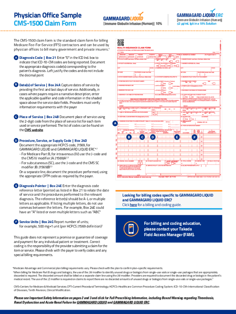 The CMS-1500 Claim Form for GAMMAGARD is a medical billing document used by physician offices to bill Medicare Fee-For-Service contractors and private insurers for GAMMAGARD LIQUID services.