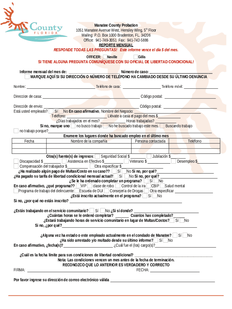 Los liberados condicionales del Condado de Manatee son los que deben completar este formulario para informar sobre su cumplimiento y actividades mensuales.