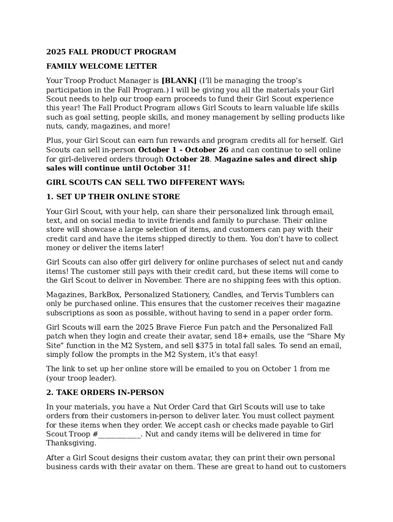 The 2025 Fall Product Program Welcome Letter is a fillable form used by Girl Scout troops to organize and manage the Fall Product Program effectively.