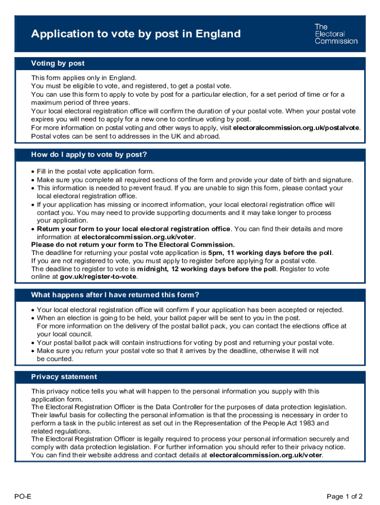 The Application to Vote by Post in England is a government form used by eligible voters to request a postal vote for elections in England.