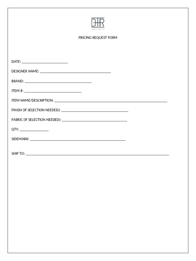The Pricing Request Form helps businesses gather quotes from suppliers or designers for specific items, aiding in procurement decisions.