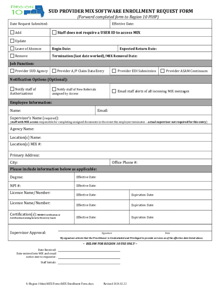 The form is primarily intended for healthcare staff, including practitioners who are integral to SUD provider agencies. Staff members responsible for managing patient care must complete the enrollment request to gain access to the MIX software. Supervisors play a crucial role in this process, as they not only oversee the submission but also ensure that the necessary verification of credentials is completed. Various healthcare provider agencies will likely require this form to facilitate their operations effectively.