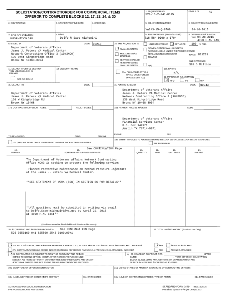 The SF 1449 form serves as a solicitation, contract, or order specifically for commercial items utilized by the Department of Veterans Affairs. This form plays a crucial role in the procurement processes for various services, including maintenance contracts such as the upkeep of Medrad Pressure Injectors at the James J. Peters VA Medical Center. With references dating back to 2015, it highlights the need for updates in its guidelines and practices.