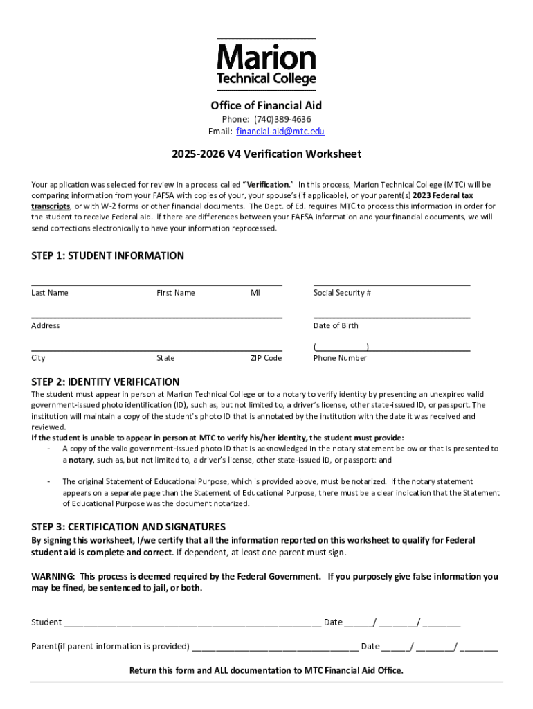 The 2025-2026 V4 Verification Worksheet is a financial aid application form used by Marion Technical College to verify students' financial information for Federal aid eligibility.