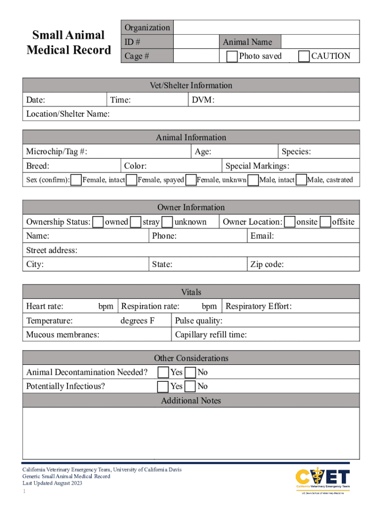 When filling out the Small Animal Medical Record Form, several common errors can occur. Missing vitals or incomplete owner information are frequent pitfalls that can affect the quality of the medical record. Therefore, it is advisable to double-check all inputted information before submission to maintain thorough records.