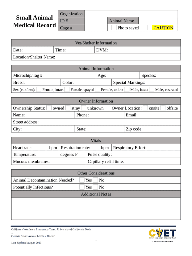 The form is primarily for veterinarians, animal shelters, and emergency veterinary teams. It helps document the medical history and treatment plans of small animals.