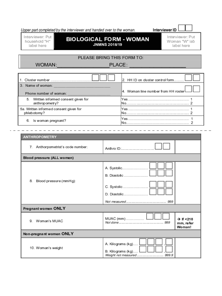 The Woman Biological Form is a crucial healthcare document designed for collecting biological and anthropometric data from women. This form plays a significant role in the healthcare sector, enabling professionals to obtain essential information for women's health assessments. It typically includes sections for personal information, anthropometric measurements, and consent for blood collection.