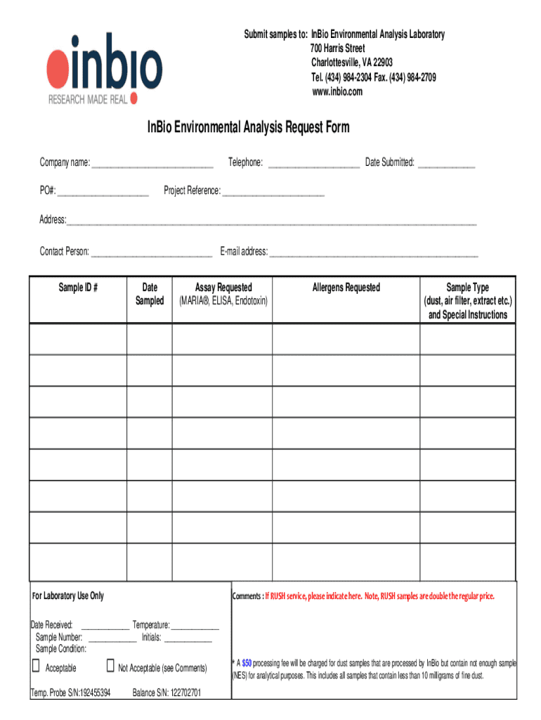 The InBio Environmental Analysis Request Form is an essential document used for submitting samples for environmental analysis specifically to the InBio Environmental Analysis Laboratory located in Charlottesville, VA. This form is critical for conducting various types of analyses, including testing for allergens and endotoxins, which are vital for maintaining safety standards across various industries.