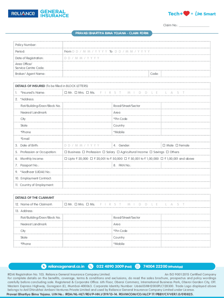 The Pravasi Bhartiya Bima Yojana Claim Form is a crucial document designed for insured individuals seeking financial benefits under the Pravasi Bhartiya Bima Yojana insurance policy. Issued by Reliance General Insurance Company Limited, this form facilitates the claims process for non-resident Indians and their dependents. To ensure validity, it requires the signatures of the insured individuals or claimants, affirming their submissions.