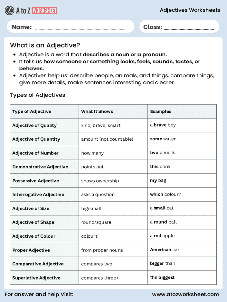 4.Before starting the exercises, ensure you have basic knowledge of adjectives and examples to reference while completing the worksheets.