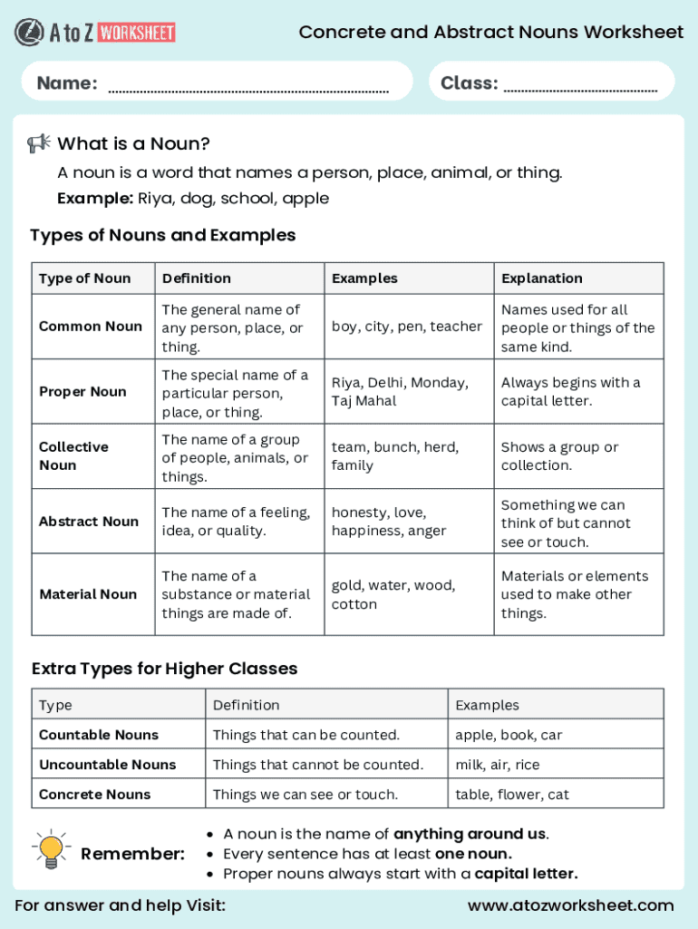 The Concrete and Abstract Nouns Worksheet is an essential educational tool designed to aid teachers and students in learning how to identify and categorize nouns. This worksheet serves a crucial role in language learning, as it helps students differentiate between concrete nouns, which are tangible and can be perceived through the senses, and abstract nouns, which represent ideas, qualities, or conditions that cannot be physically touched. Incorporating this nouns worksheet PDF into the curriculum enhances the understanding of these fundamental language components.