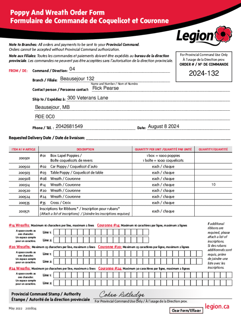 The Poppy And Wreath Order Form is intended for use by branches of the Canadian Legion and other authorized organizations needing to order poppies and wreaths for memorial events.