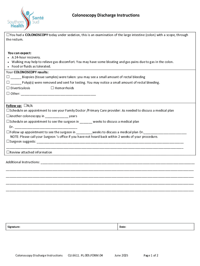 Get the free Colonoscopy Discharge Instructions