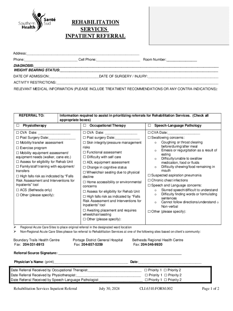 The Rehabilitation Services Inpatient Referral Form is a healthcare document used by referral sources to prioritize referrals for rehabilitation services in Manitoba, Canada.