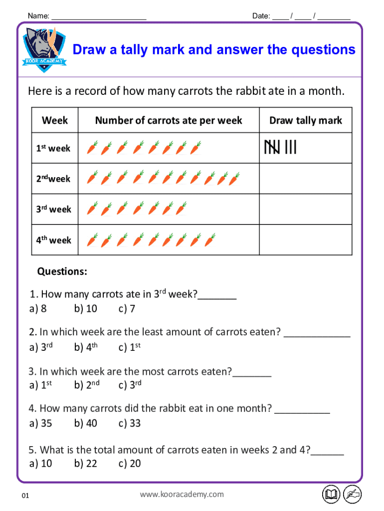 The Carrot Consumption Tracker is an educational form designed specifically for pet owners and educators to record the carrot consumption of rabbits. This tracker employs a structured approach, featuring tally marks and multiple-choice questions to facilitate the collection of dietary data. By utilizing this educational form PDF, users can gain insights into their rabbits' eating habits.