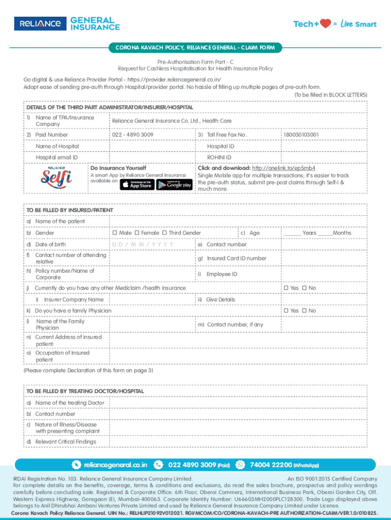 The Corona Kavach Policy Claim Form is a healthcare document used by patients, doctors, and hospitals to request cashless hospitalization under the Reliance General Insurance policy.