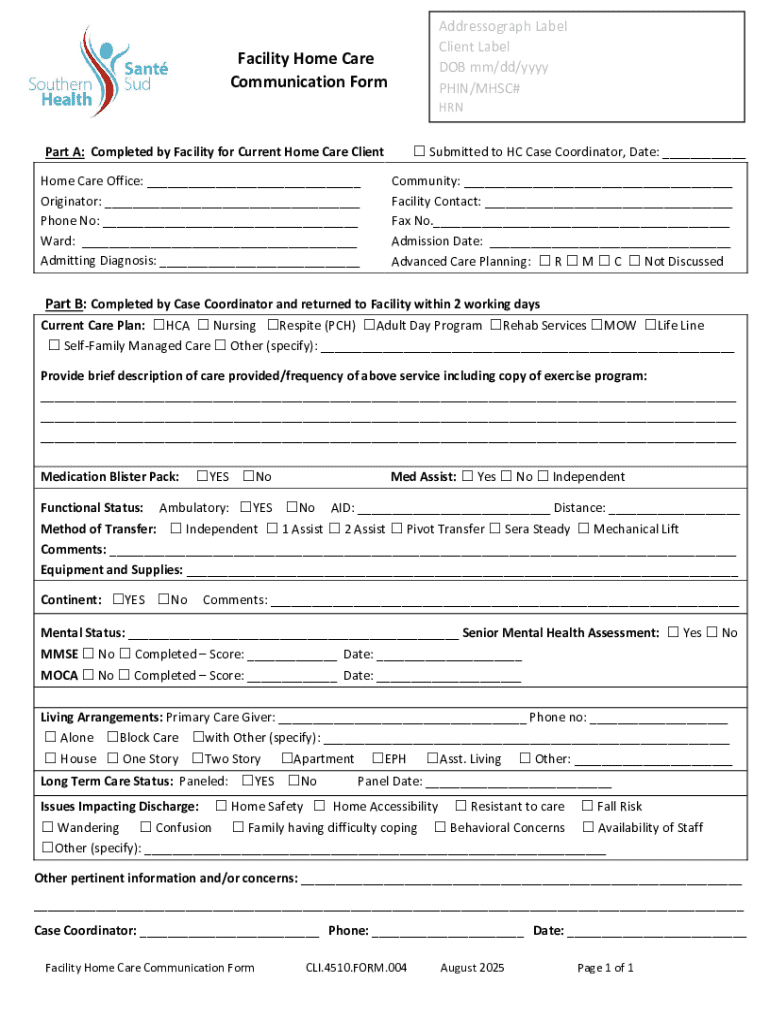 The Facility Home Care Communication Form is typically completed by healthcare facilities and case coordinators involved in the care management of home care clients. Any authorized personnel from these entities can fill out the form.